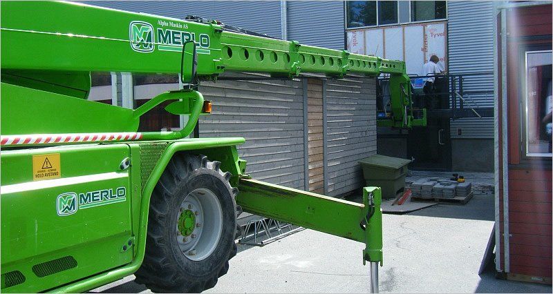 Vi har ein Merlo roterande teleskoptruck med firhjulstrekk og styring på alle hjul. Løftekapasiteten er på 6 tonn med ei bomlengde på 24 meter.